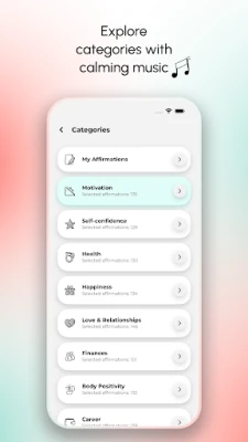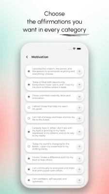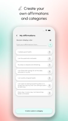 Kad jūsų kelionė būtų kuo lengvesnė ir efektyvesnė, Daily Affirmations Mirror siūlo platų kategorijų spektrą – nuo sveikatos ir savivertės iki sėkmės ir laimės, užtikrindamas, kad visada rasite tai, ko jums reikia. Be to, galite kurti savo asmenines afirmacijas ir jas suskirstyti į pritaikytas kategorijas, visiškai pritaikydami programėlę savo unikaliam keliui. Kasdieniai priminimai užtikrins, kad niekada nepamiršite skirti laiko sau ir įkvėpimui.